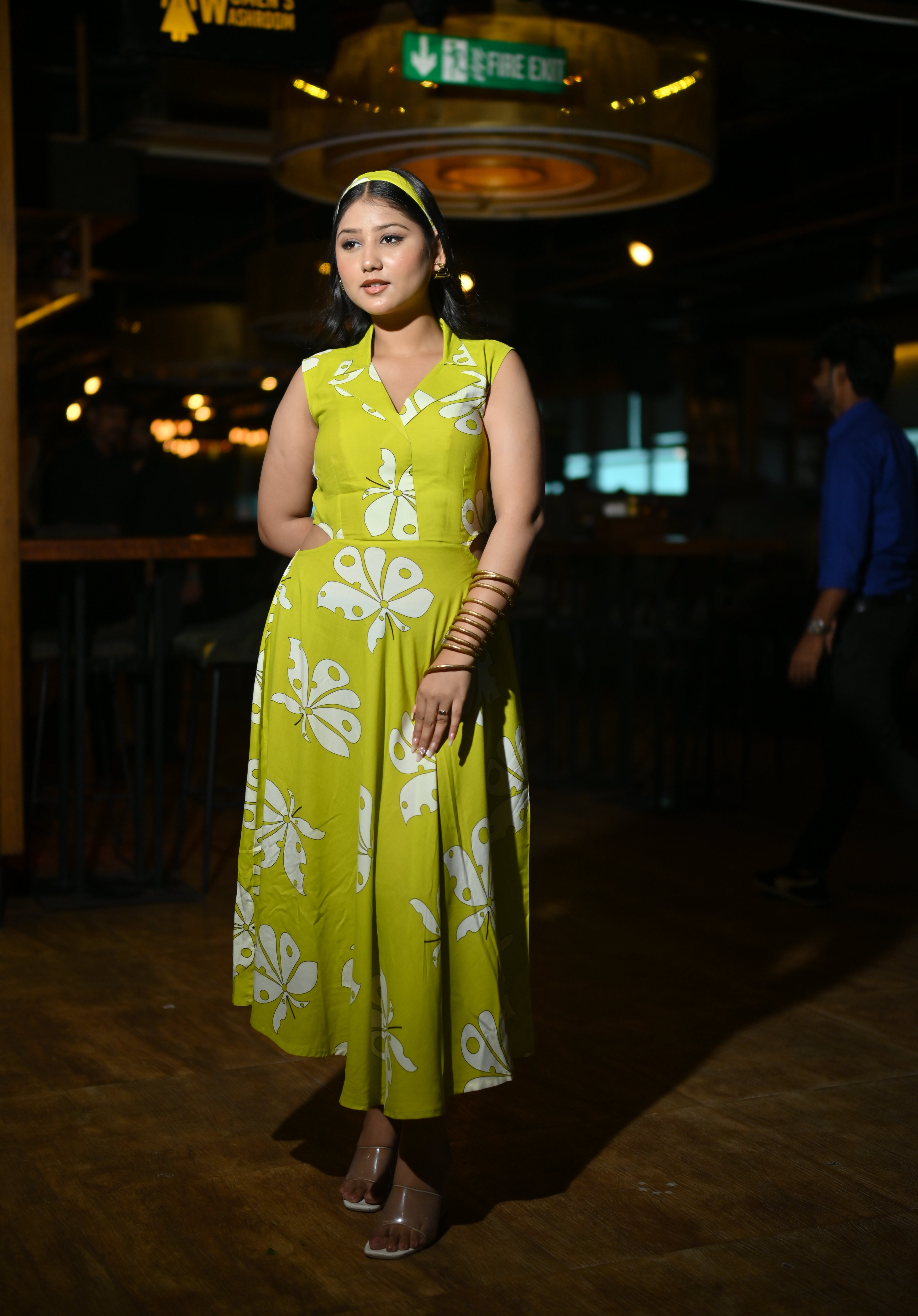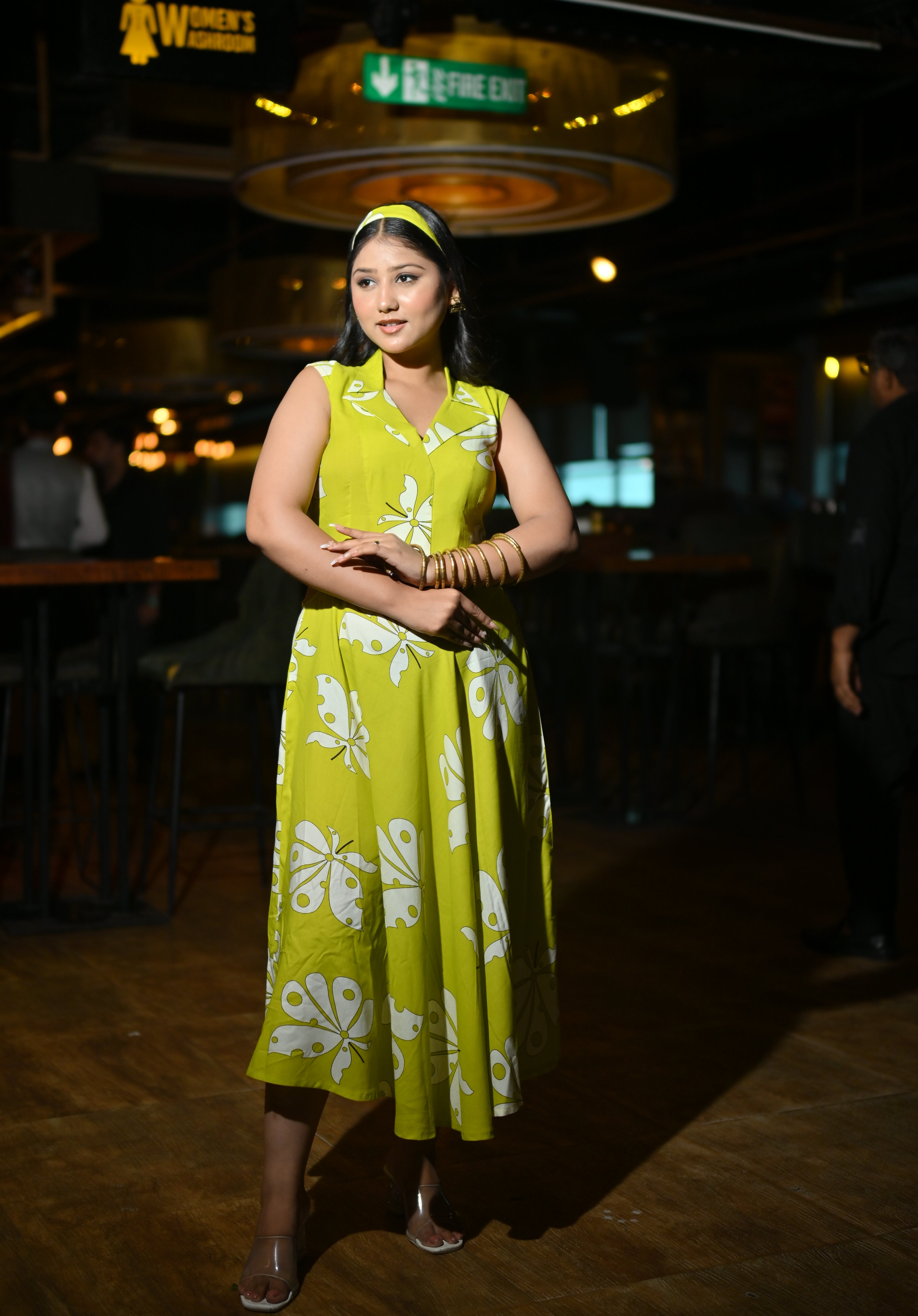 Lime Green Butterfly Print Sleeveless Midi Dress with V-Neckline with Scraf