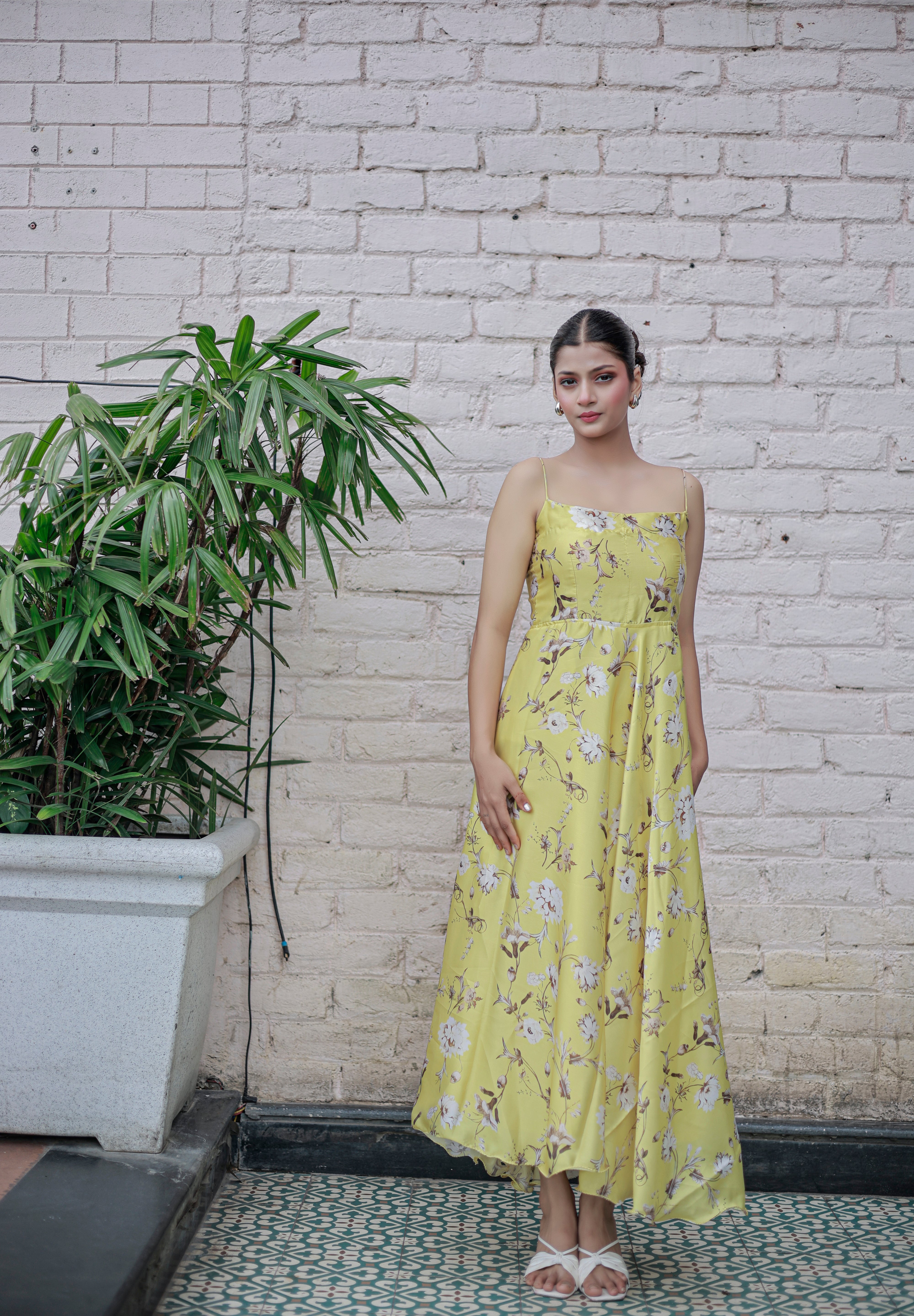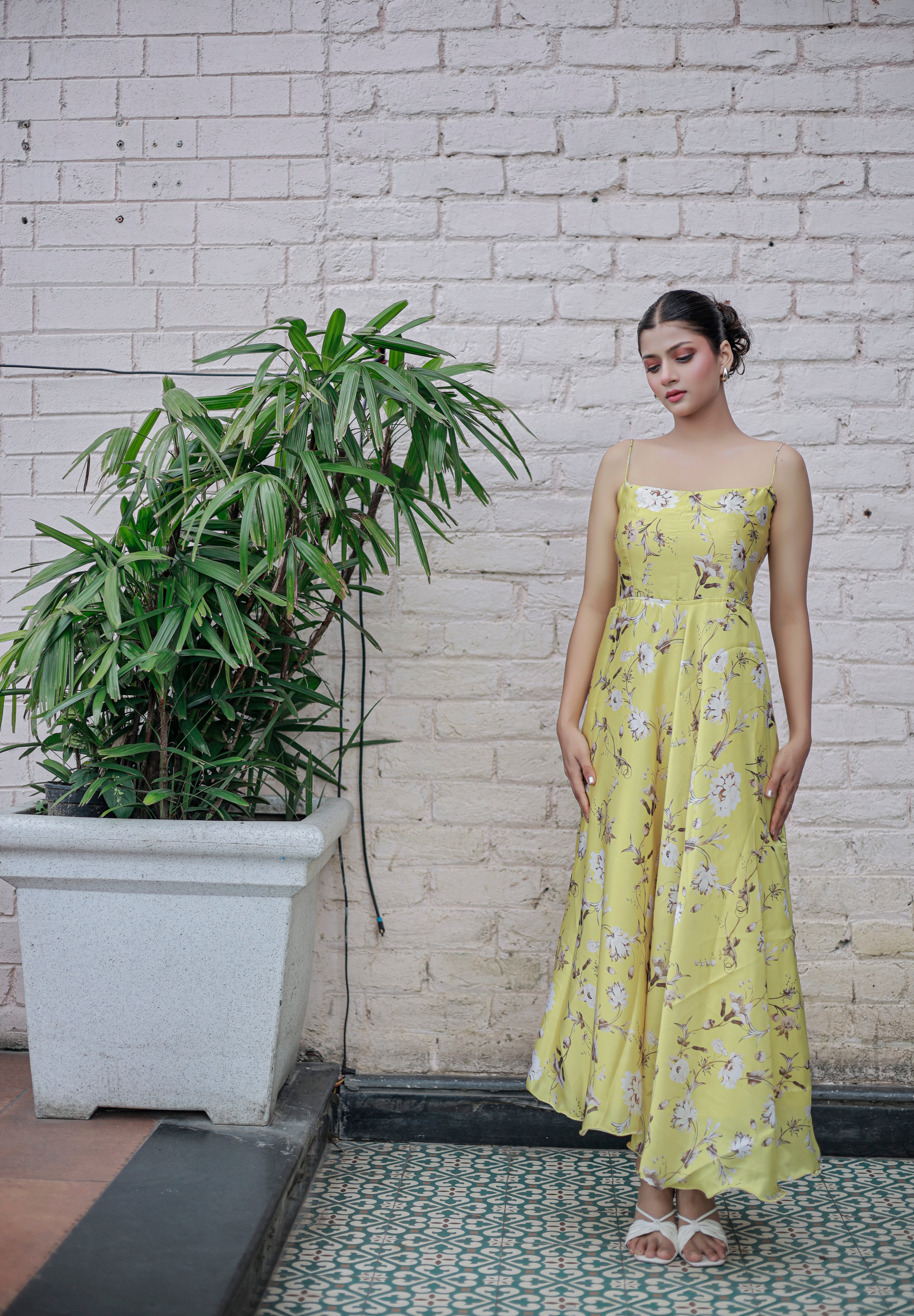 Floral Print Sleeveless Yellow Maxi Dress with Spaghetti Straps and Flared Hemline