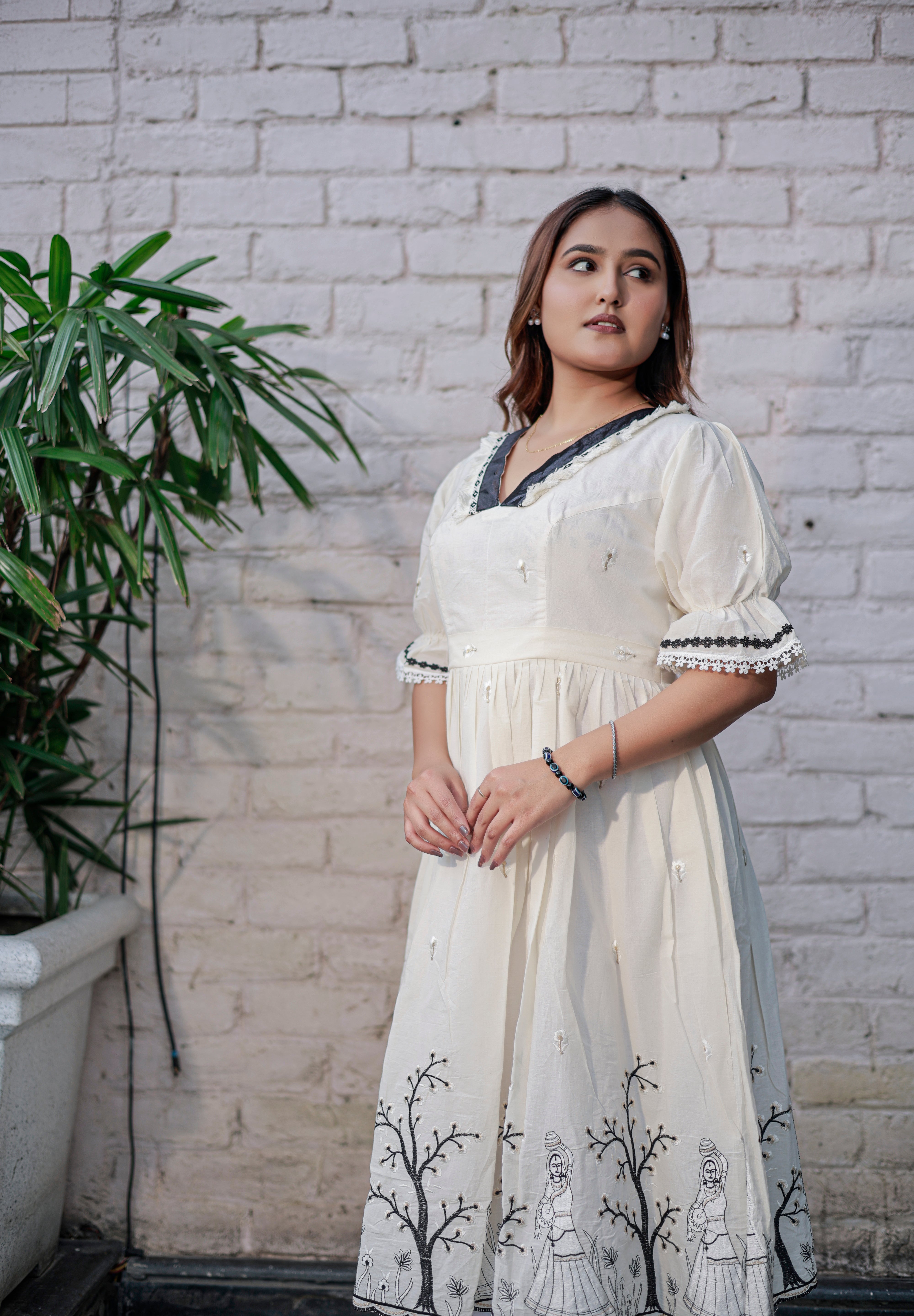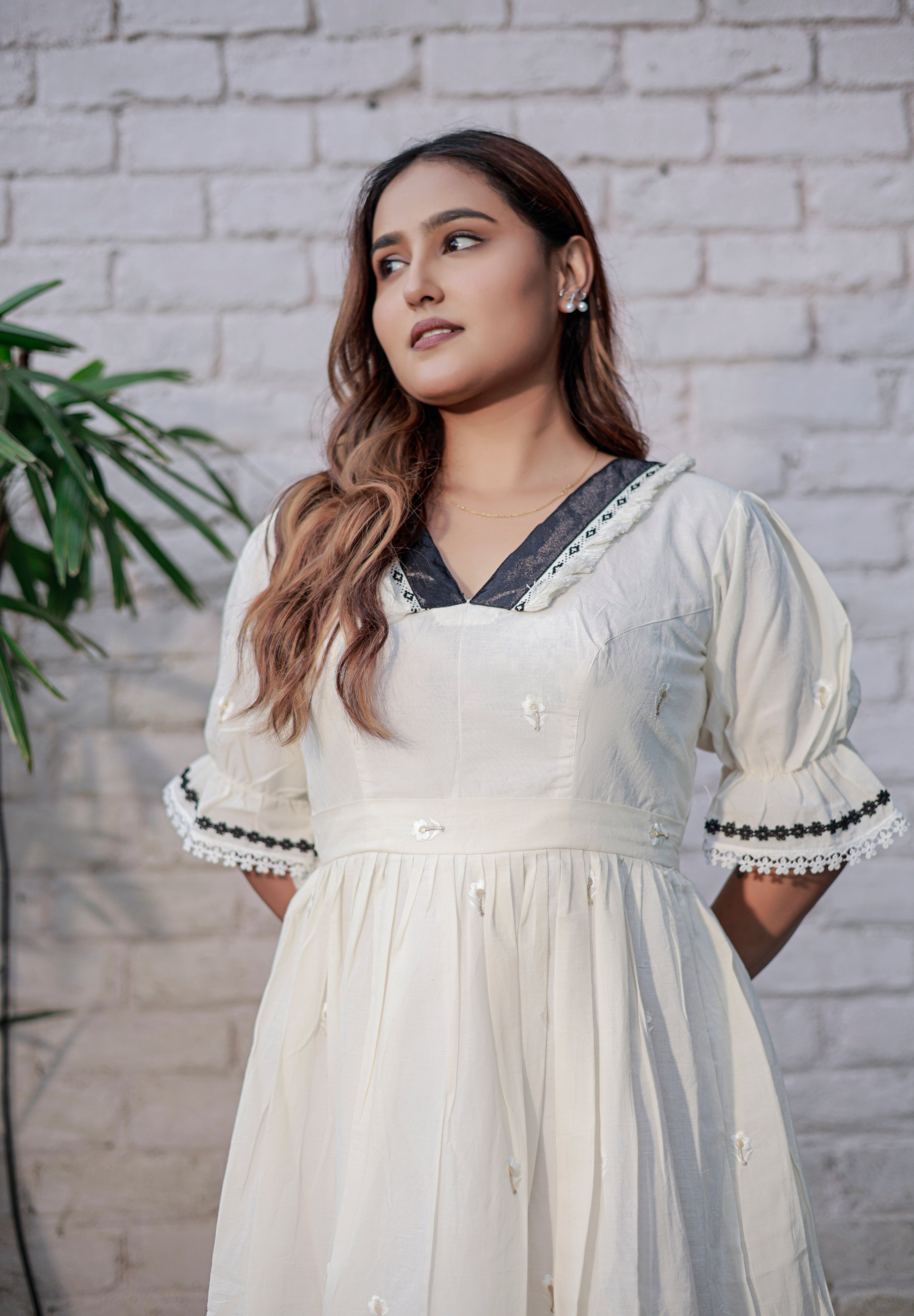 Women's Ivory White Cotton Dress with Black Lace V-Neck, Puff Sleeves, Embroidered Detailing & Flared Fit – Elegant Casual & Semi-Formal Wear