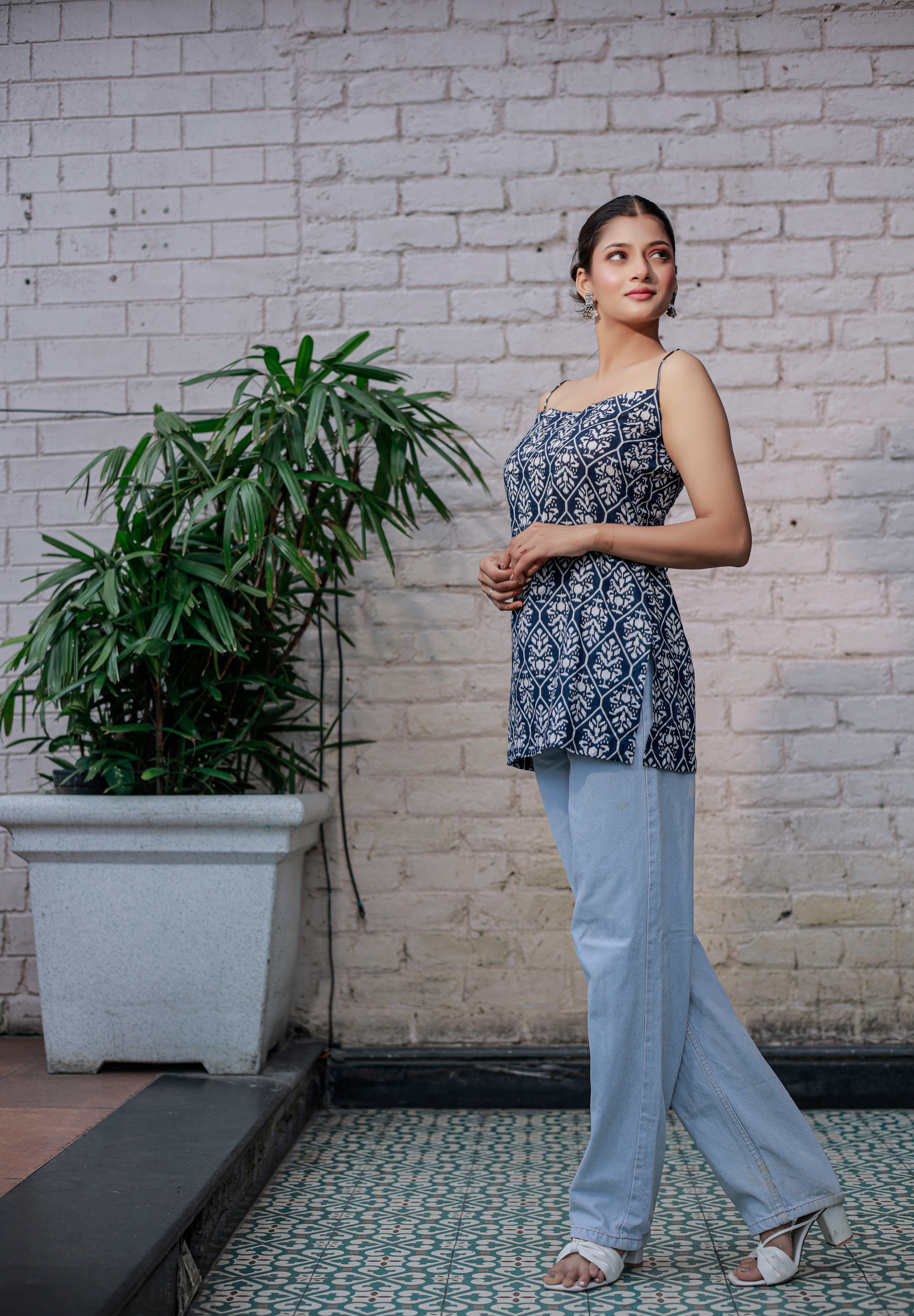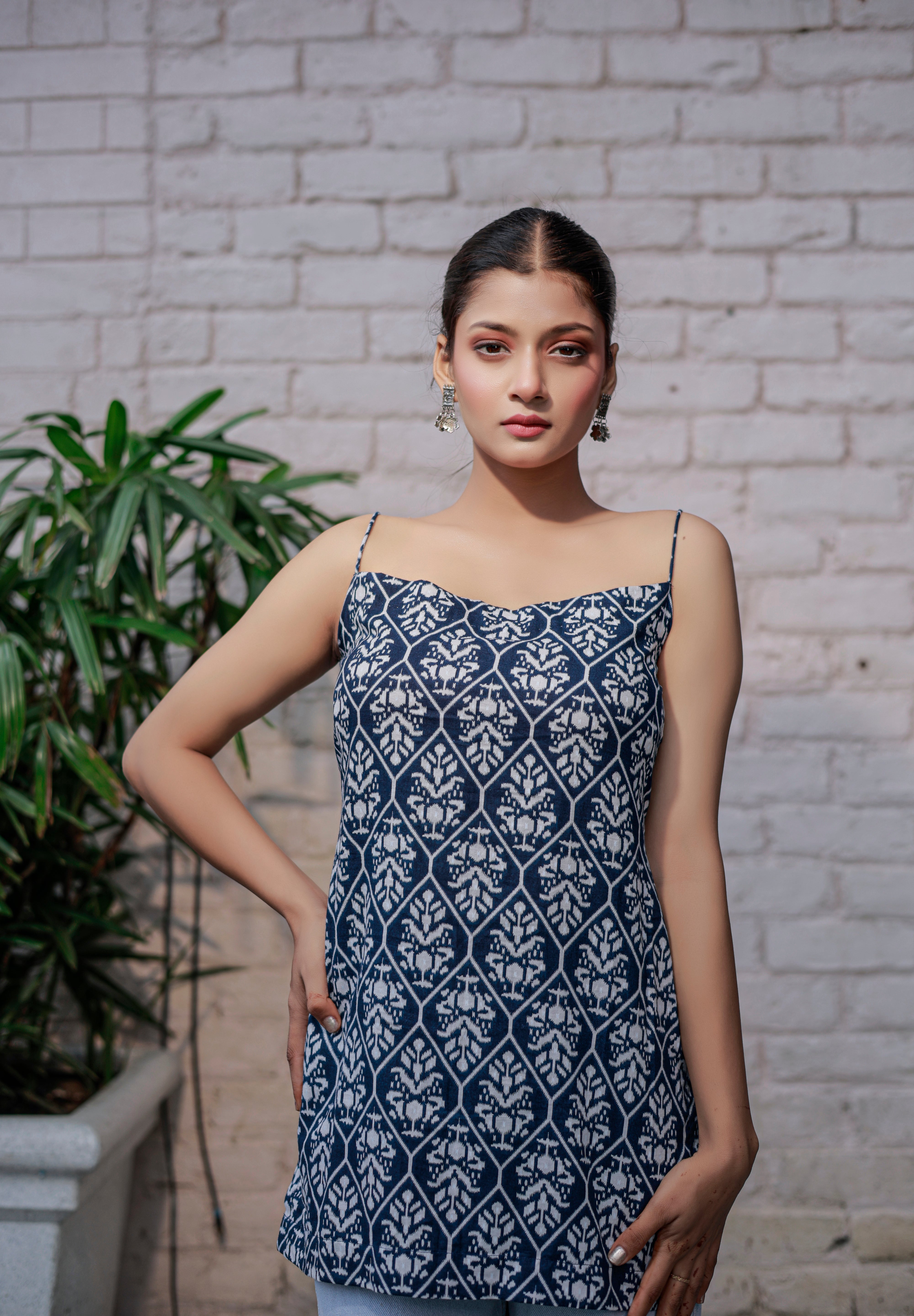 Blue printed sleeveless spaghetti strap top with white leaf-like patterns